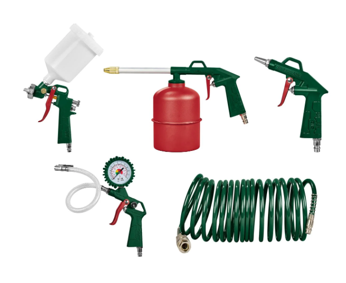 Ez a 5 részes készlet ideális megoldás a festékek, lakkok és egyéb folyadékok felvitelére, fújására és felfújására. A készlet tartalmaz pneumatikus festékszóró pisztolyt, fújópisztolyt, gumiabroncs pumpát, valamint spirál tömlőt, amelyek minden szabványos kompresszorral használhatóak.